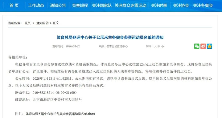 1月23日,国度体育总局在官网发布了《体育总局冬运中心对于公示米兰冬奥会参赛通顺员名单的奉告》。