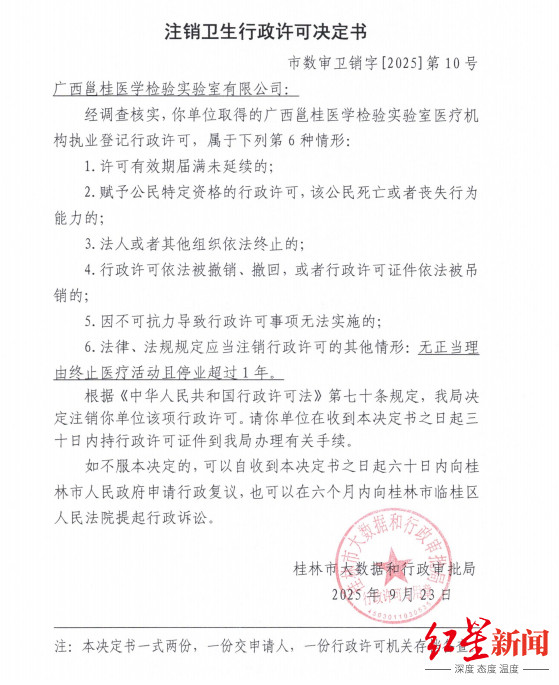 黄女士告诉记者,形态停滞后邕桂公司仍需每月交纳方式房钱、披发工资、小器开荒等,每月支拨约30万元。2025年11月,邕桂公司被物业方诉至法院并进入强制实行圭臬,其3套医疗器械已被拍卖偿债。同期因未开业,桂林市大数据和行政审批局于2025年9月对其发出刊出卫生行政许可决定书。