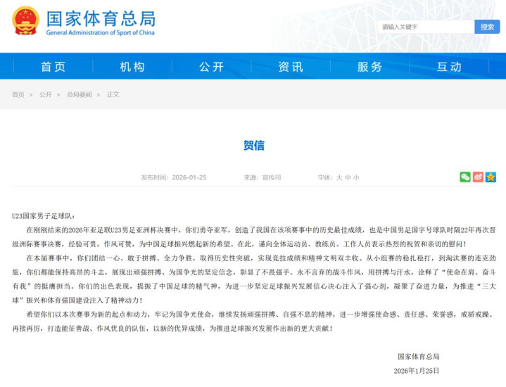 1月25日,国度体育总局向U23国足致贺信。信中称,U23男足勇夺亚军“教训选藏,气派可赞,为中国足球振兴燃起新的但愿”。