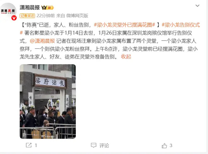 今天的深圳龙岗殡仪馆,被一层谨慎又关怀的氛围牢牢包裹,空气里都浸着杰出时光的不舍。77岁功夫巨星梁小龙的告别庆典在此静静举行,灵堂表里早已摆满了重重叠叠的花圈,白皙的菊花与墨色挽联相映澄净,用最千里静的款式,送别这位承载了几代东谈主芳华缅思的“陈真”先生。