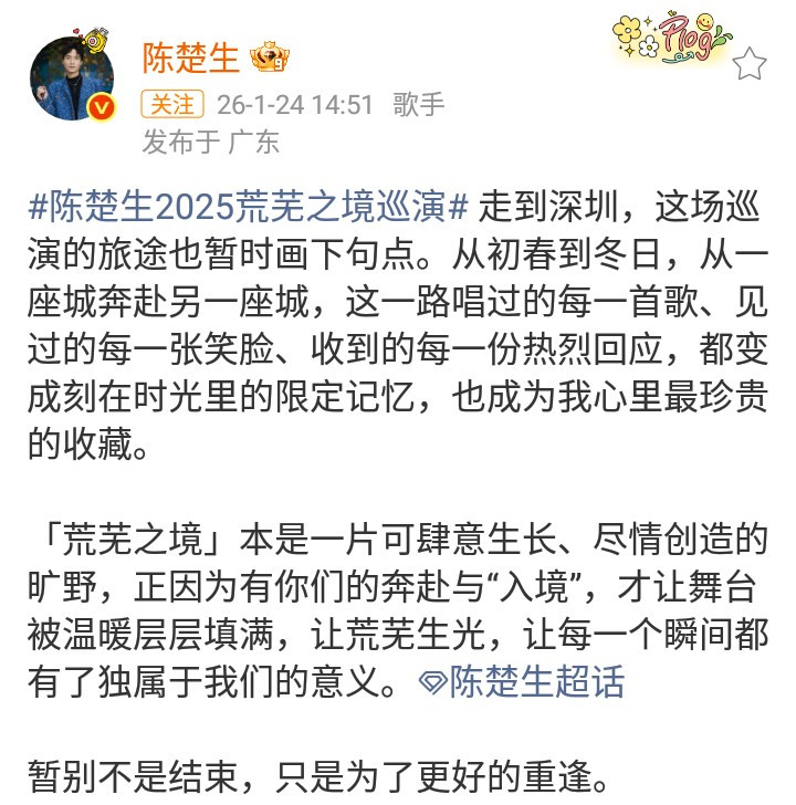 固然了,歌手陈楚生除了接到大湾区春晚的邀请函除外,他在前不久圆满完成了2025萧疏之境巡演! 歌手陈楚生在发文中写谈:从初冬到冬日,这一合唱过的每一首歌,成为我心里最珍稀的储藏!陈楚生的歌手情感,就这么澄澈感东谈主!他老是卤莽与不雅众扫数感受经典舞台的歌曲好意思好!